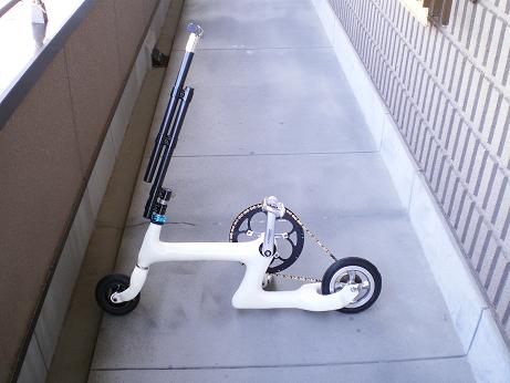 さて、初心忘れるべからずということで、私のコンセプトに合う移動手段で、過去に発売された道具をよーく思い出してみると、それはやはりキックボードになるだろうと考えました。しかもキックボードは試作車の問題点であった重くなる部品(=自転車のクランク部品など)が使われていないわけでして、そのことからも必然的に思いつく乗り物だったのです。