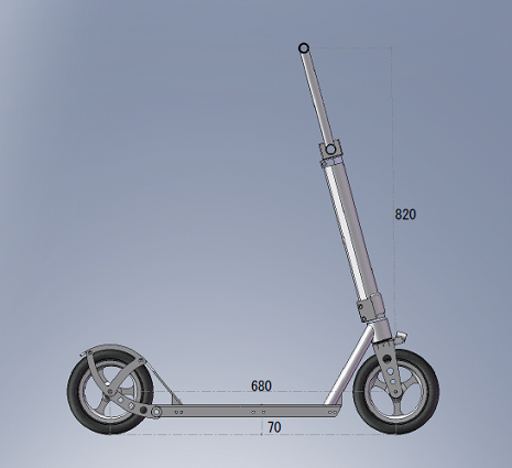 ちなみに、最終仕様の主要寸法は添付画像の通りとなります。プロトタイプとの大きな変更点としては、全体のサイズをコンパクトにしたことと、ヘッドチューブに楕円パイプを使用しハンドル部の剛性を高めたことです(ちなみにハンドル部はプロトタイプと同様に、前後・伸縮調整が可能となっています)。