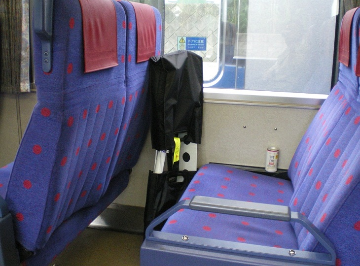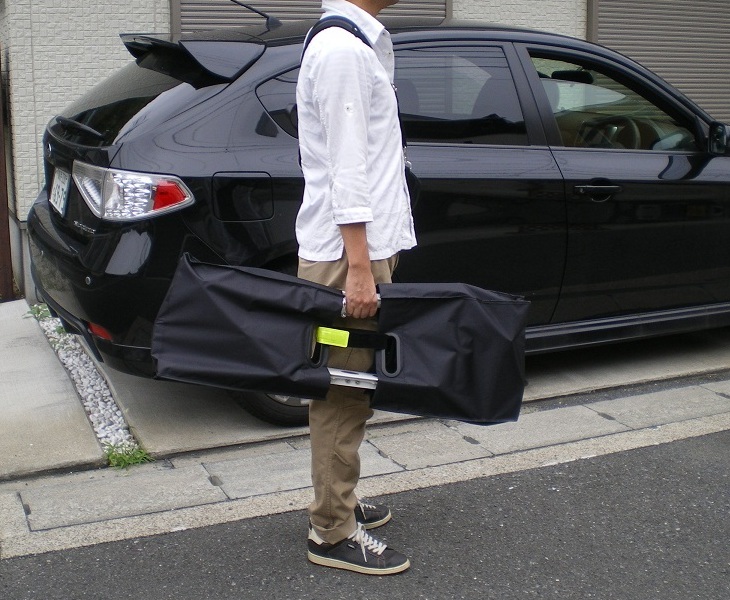 3.持ち運んでいる写真は、100円ショップで買った袋を前後から挟み込み、黄色のマジックテープで無理やり止めています。ただし意外にしっくりきて、専用袋っぽくて気に入っています(笑)。それより、黒い車の前で分かりづらくてスミマセン。。ちなみに身長は165cmです。